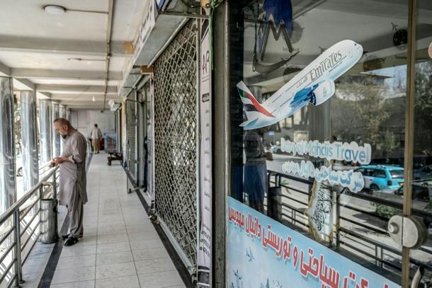 An Afghan employee stands outside his travel agency office as life ground to a halt after Taliban authorities abruptly cut internet and mobile phone networks