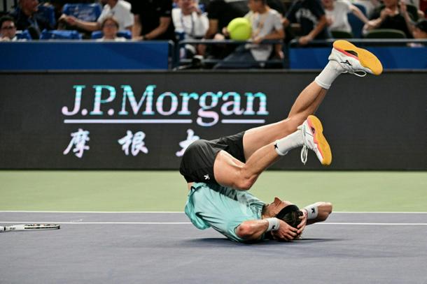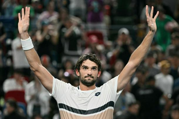 France's Arthur Rinderknech celebrates after winning against Russia's Daniil Medvedev at the end of their men’s singles semi-final match during the Shanghai Masters tennis tournament in Shanghai