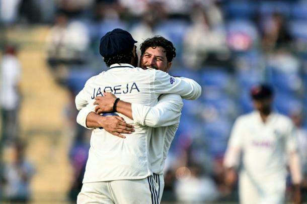 India's Kuldeep Yadav (R) celebrates with Ravindra Jadeja