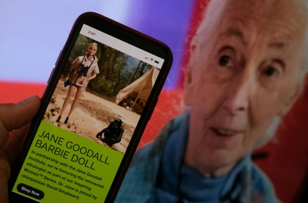 American toy manufacturer Mattel's Barbie dolls modeled on primatologist Jane Goodall and her research specimen, a chimpanzee named David Greybeard