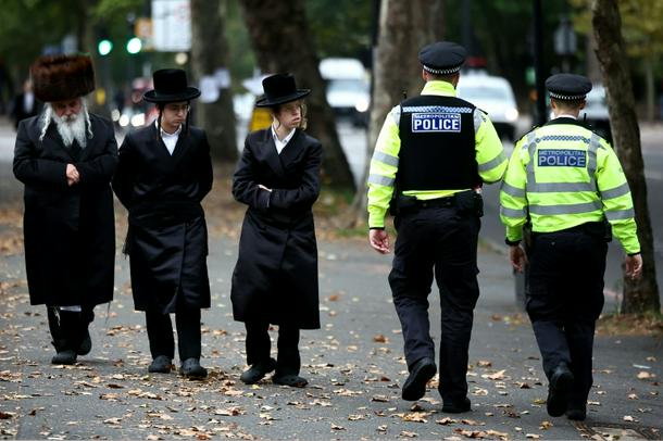 Manchester police at the scene of a car ramming and stabbing incident outside a synagogue